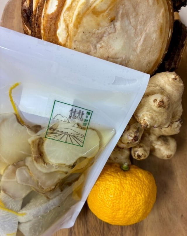 季節の野菜とハーブ・果物を組み合わせた今だけのピクルスです。 畑から加工に至るまで、作り手の手仕事を重ねて出来上がったピクルス。一般的なピクルスと比べ塩分・酸味は低く、野菜やハーブの風味・食感を大切に作っています。 和食にも寄り添うリピーター続出の而今シリーズ「親さん菊さん」 「親さん菊さん」而今nikon 親里芋のホクッ、菊芋のシャキッ。食感のコントラストとゆずが絶妙 原材料:親里芋(兵庫県産)、菊芋(兵庫県産)、漬け原材料〔醸造酢(滋賀県製造)、生ザラメ(鹿児島県製造)、はちみつ(非加熱)、塩、ゆず〕