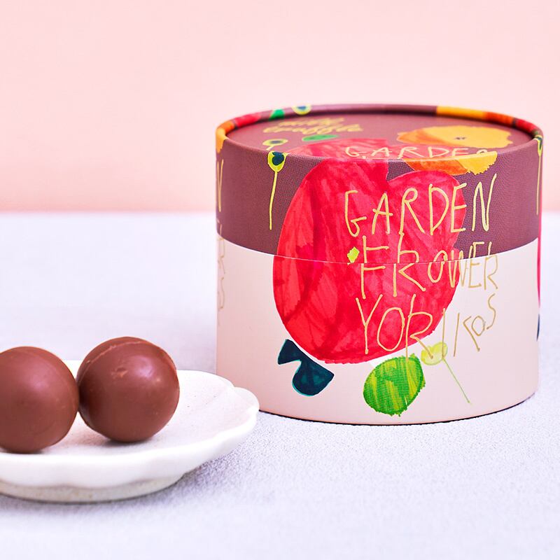 トリュフチョコレート ミルクは、山本 頼子さんの「GARDEN…」のアートワークがデザインされたパッケージ。