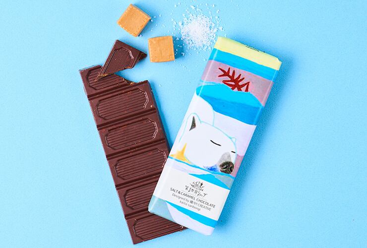 ソルト&キャラメルチョコレートは、三本木 海人さんの「雪原の異世界」のアートワークがデザインされたパッケージ。